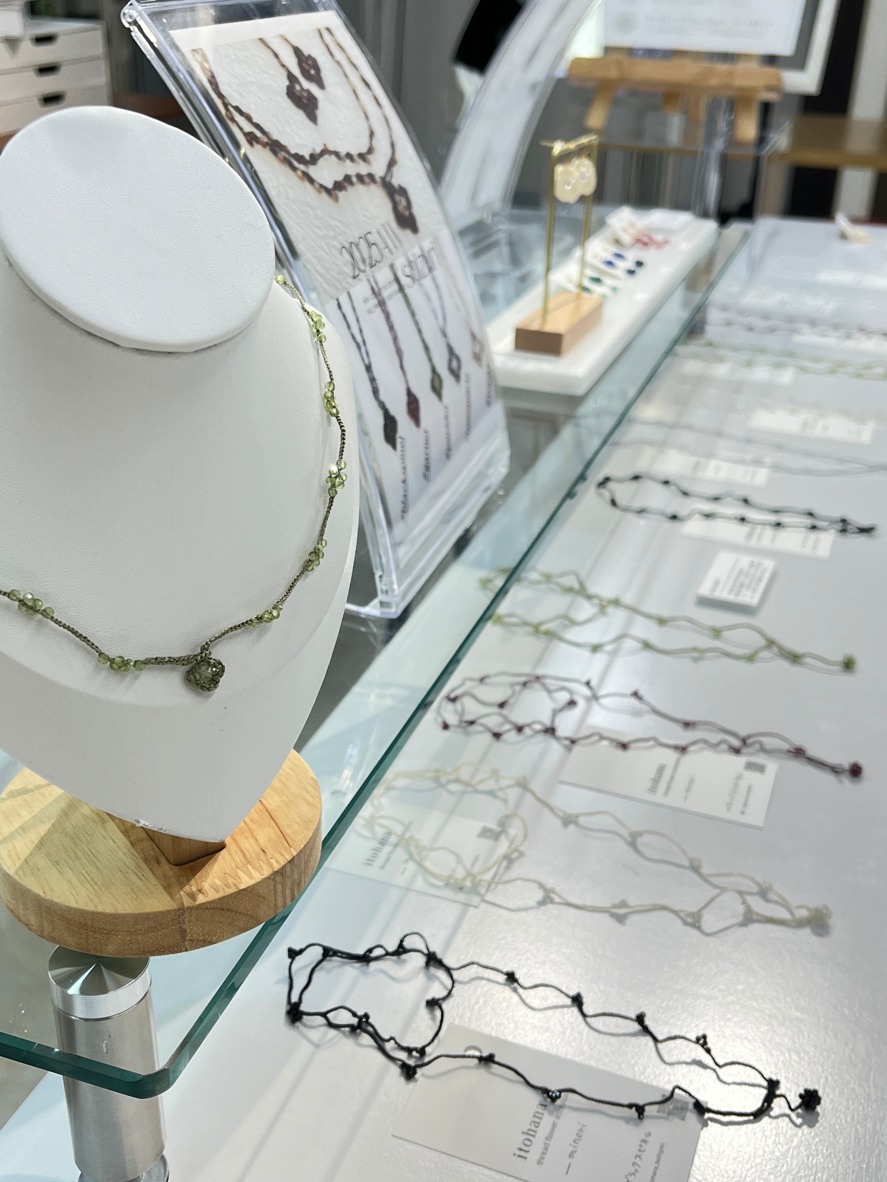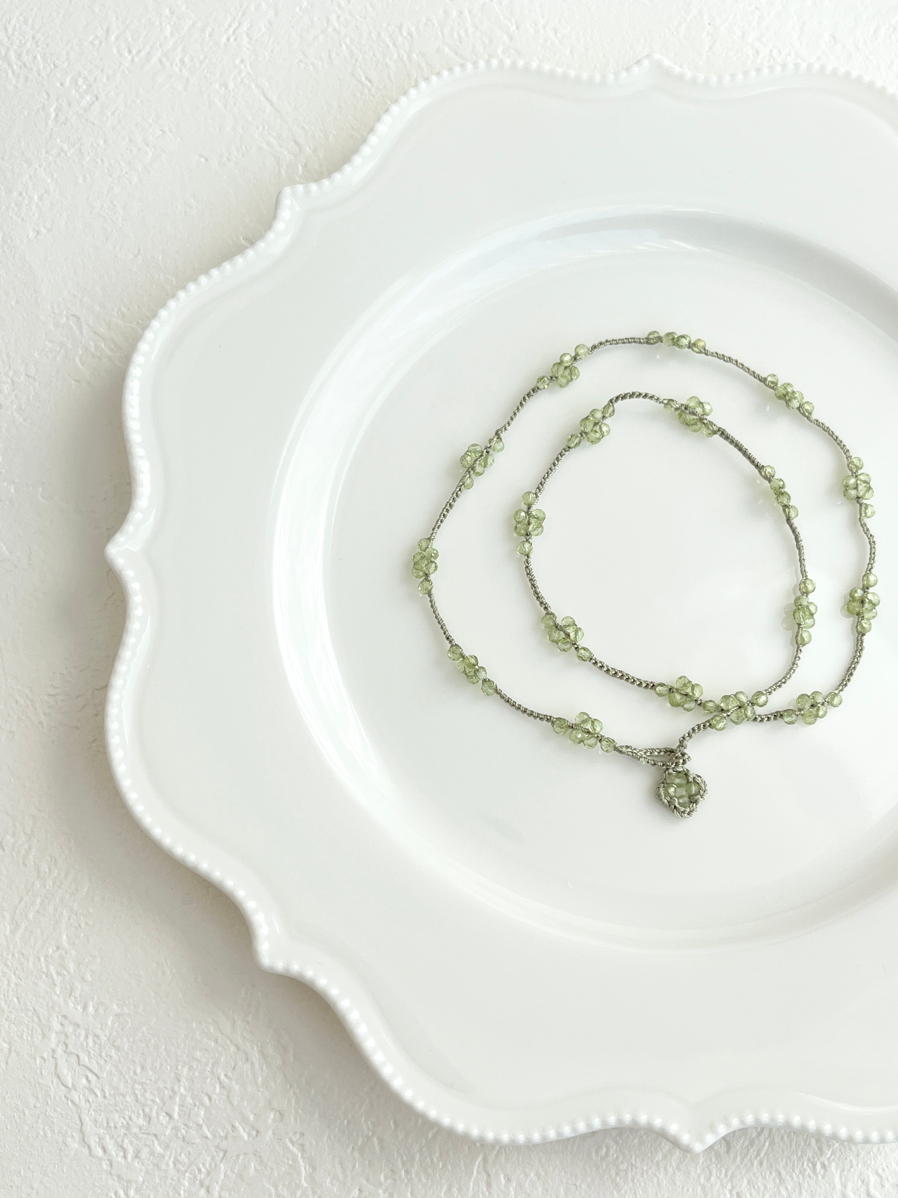 透明感があり優しく輝く美しいペリドットと、まるでシルクのような艶感のあるトルコの糸を使用しています。